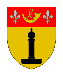 D’or à la colonne à perron surmontée d’une globe sommé d’une croix, le tout de sable, au chef de gueules au cor contourné d’or accosté de deux fleurs de lis d’argent