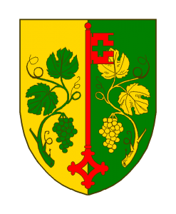 Parti d’or et de sinople à deux pampres fruités, feuillés et vrillés de l’un en l’autre; à la clef de gueules, le panneton en haut à senestre, brochant en pal sur la partition