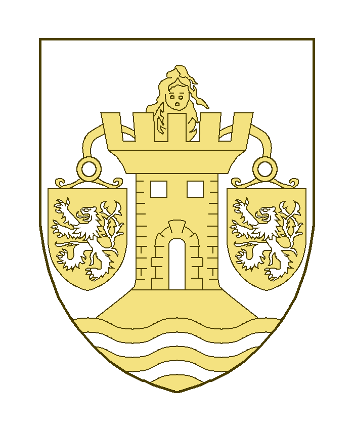 Une tour crénelée posée sur une rivière et accostée de deux écussons chargés d’un lion la queue fourchue et passée en sautoir lesdits écussons pendant de deux arceaux issant d’entre les créneaux de la tour
