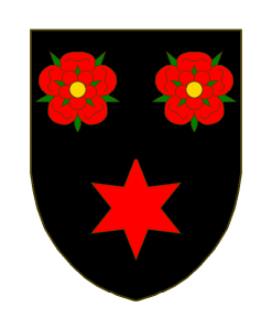 De sable à deux roses de gueules, feuillées de sinople et boutonnées d’or, accompagnées en pointe d’une étoile à 6 rais, de gueules.