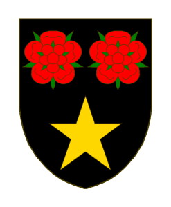 De sable à deux roses de gueules, feuillées de sinople, accompagnées en pointe d’une étoile (5) d’or.