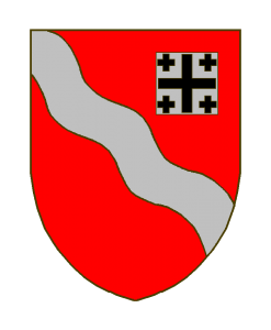 De gueules à la bande ondée d’argent, accompagnée en chef d’un carré d’argent à la croix aléséede sable cantonnée de 4 croisettes du même.