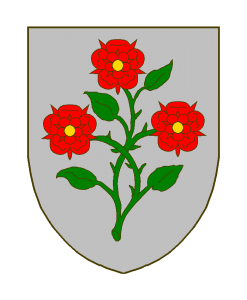 D’argent à deux branches croisées de rosier, feuillées de sinople, issant d’une tige de sinople en fasce, chargées de trois roses de gueules boutonnées d’or, posées 1-2.