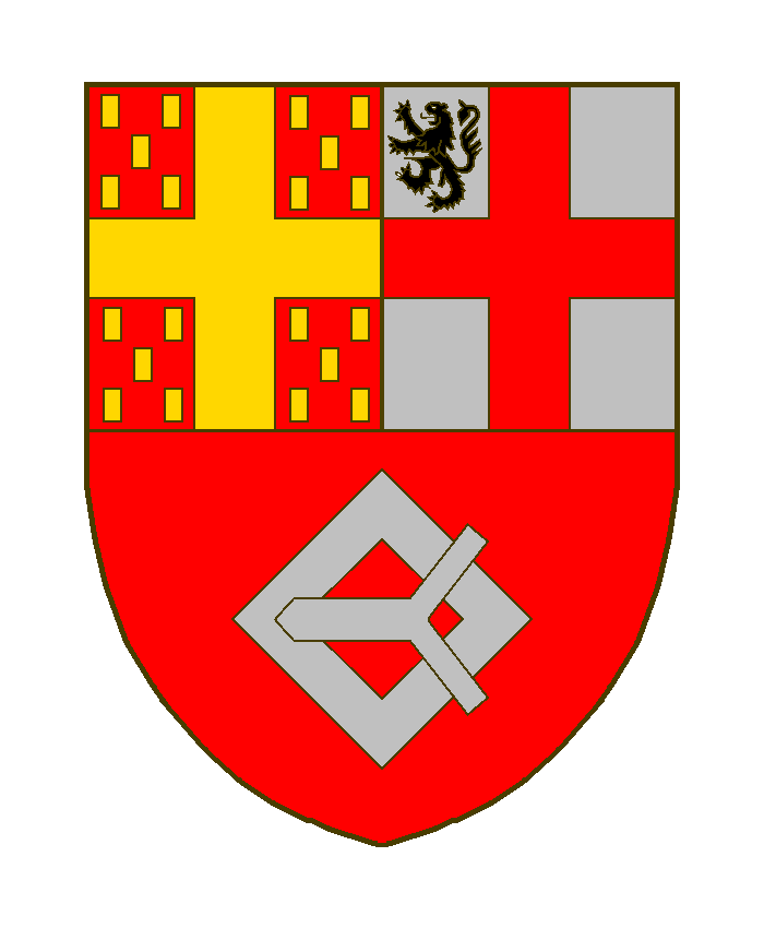 Coupé, en chef parti d’Autel, comme ci-dessus, et de Haraucourt qui est d’or à la croix de gueules, le premier quartier d’argent au lion de sable, en pointe de Hollenfels, qui est de gueules au fermail carré d’argent.
