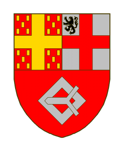 Coupé, en chef parti d’Autel, comme ci-dessus, et de Haraucourt qui est d’or à la croix de gueules, le premier quartier d’argent au lion de sable, en pointe de Hollenfels, qui est de gueules au fermail carré d’argent.
