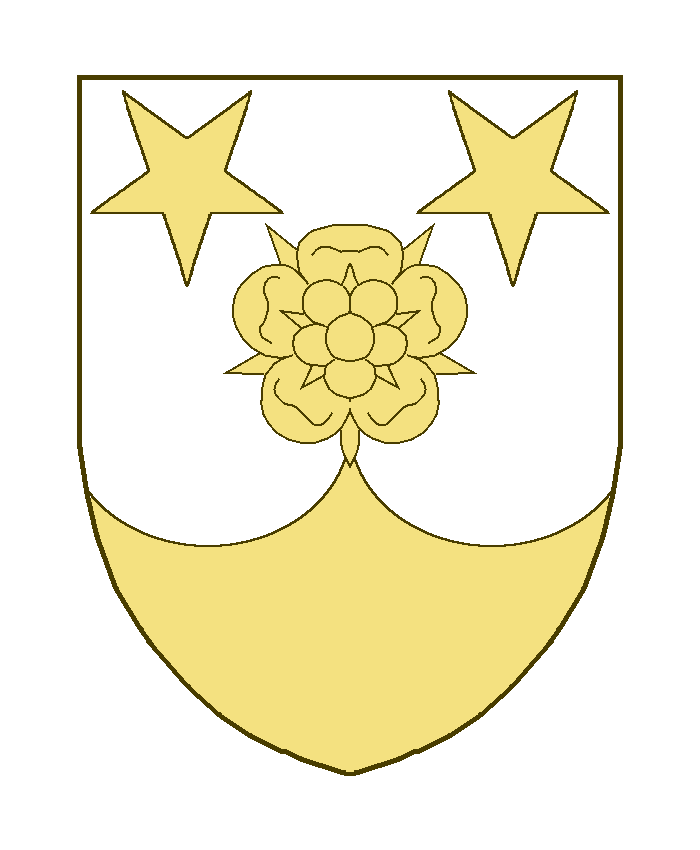 Une rose en abîme accompagnée en chef de deux étoiles à cinq rais renversées, la pointe chapée-ployée.