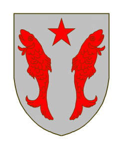 D’argent à 2 poissons adossés de gueules accompagnés d’une étoile de même en chef.