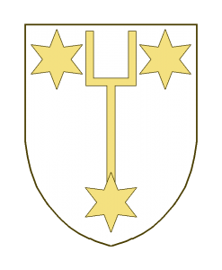 Un meuble en forme de fourche à deux dents posées en pal accosté en chef de deux étoiles (6) une troisième étoile brochant en pointe sur la tige du meuble.