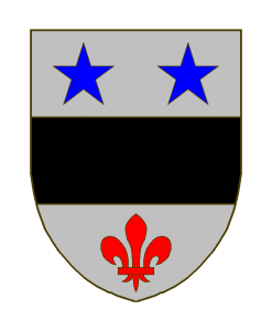 D’argent à une fasce de sable accompagné en chef de deux étoiles (5) d’azur, en pointe d’une fleur de lis de gueules.