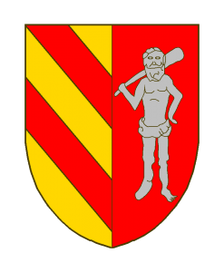 Parti, au I d’or à deux bandes de gueules, au II de gueules au sauvage tenant une masse sur l’épaule, le tout d’argent.