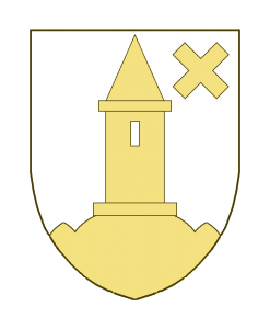 Une tour à toit pointu, posée sur un mont de trois coupeaux, et accompagnée en chef, à sénestre, d’un flanchis.