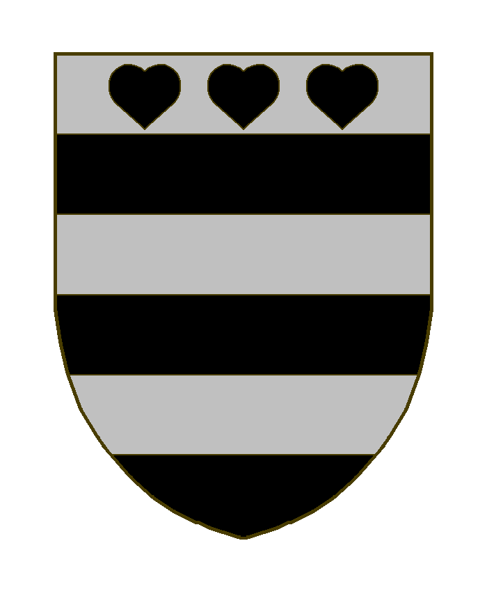 fascé d’argent et de sable (ou d’argent à trois fasces de sable) la première chargé de trois coeurs de sable.