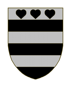 fascé d’argent et de sable (ou d’argent à trois fasces de sable) la première chargé de trois coeurs de sable.