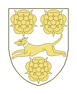 Un lévrier élancé, accompagné de trois roses, deux en chef, une en pointe.