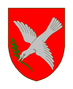 De gueules à la colombe fondante d’argent, tenant en son bec une branche de laurier de sinople posée en bande.