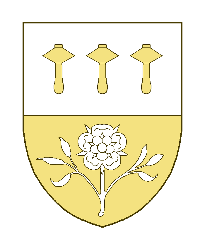 Coupé, en chef à trois marteaux à pointe ou piolets en pal, rangés en fasce, en pointe une rose tigée et feuillée.