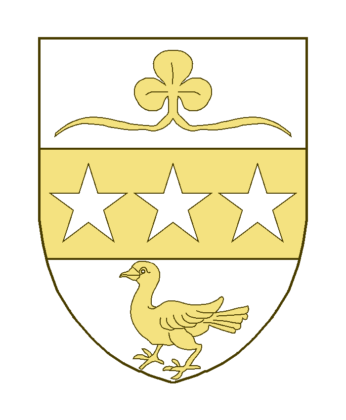 Une fasce chargé de trois étoiles, surmontée d’un trèfle à deux racines, et accompagnée en pointe d’un oiseau.