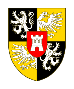 Écartelé, aux I et IV de sable au lion de …, celui du IV contourné, aux II et III d’or à la demi-aigle (de sable?) mouvant de la partition; sur le tout de gueules A. une tour de .. .