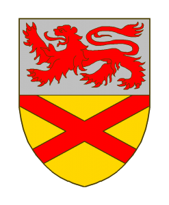 Coupé, en chef d’argent au lion léopardé de gueules, en pointe d’or au sautoir de gueules.