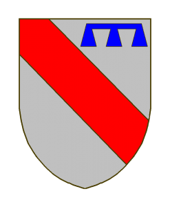 D’argent à la bande de gueules, accompagnée en chef d’un lambel d’azur.