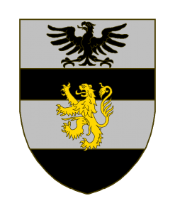 D’argent à la fasce de sable et une champagne du même, en chef une aigle de sable soutenue de la fasce, en pointe un lion d’or soutenu de la champagne , la tête brochant sur la fasce.