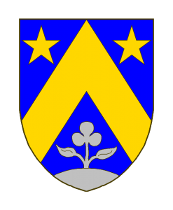 D’azur au chevron d’or, accompagné en chef de deux étoiles (à 5 ou 6 rais) du même, en pointe d’un trèfle tigée et feuillé de deux feuilles d’argent, mouvent d’une terrasse du même.
