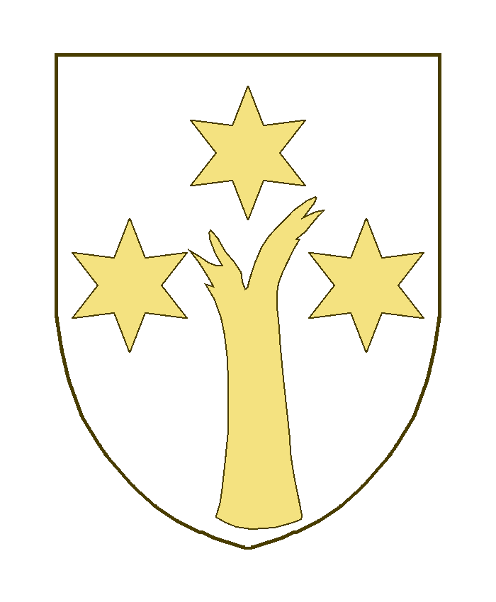 Un tronc à deux branches cassées, accompagné de trois étoiles à six rais, une en chef, deux aux flancs.