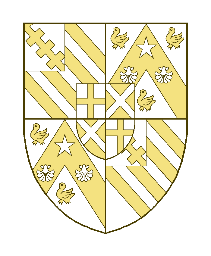 Écartelé: aux I et IV à 4 bandes, au franc-quartier chargé d’une bande bretessée, aux II et III un chevron chargé de deux coquilles et d’une étoile en chef, et accompagné de trois merlettes. Sur le tout contre- écartelé à une croix et au sautoir.Sources du Dr. Loutsch: