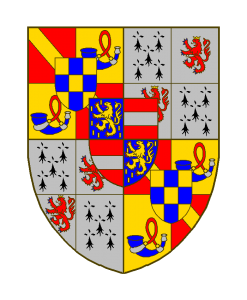 Écartelé: aux I et IV contre-écartelé de gueules à la bande d’or (Chalon) et d’or au cor de chasse d’azur, lié de gueules, virolé et enguiché d’argent (Orange), et sur le tout cinq points d’or, équipolés à quatre d’azur (Genève); aux II et III contre- écartelé d’hermine (Bretagne) et d’argent au lion de gueules, armé et lampassé d’azur, couronné d’or (Luxembourg); Sur le tout du tout un écusson contre- écartelé d’azur au lion d’or, armé et lampassé de gueules, le champ semé de billettes d’or (Nassau) et de gueules à la fasce d’argent (Vianden).