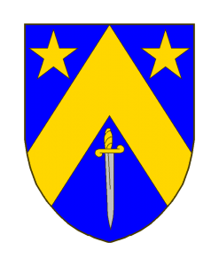 D’azur au chevron d’or, accompagné en chef de deux étoiles du même, en pointe d’une épée d’argent garnie d’or, mise en pal, la pointe en bas.