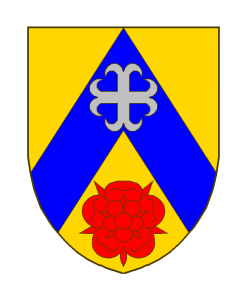 D’or au chevron d’azur, chargé d’une croix ancrée d’argent et accompagné en pointe d’une rose de gueules.