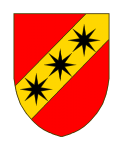 De gueules à la barre d’or, chargé de trois étoiles à huit rais de sable.