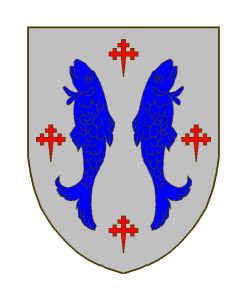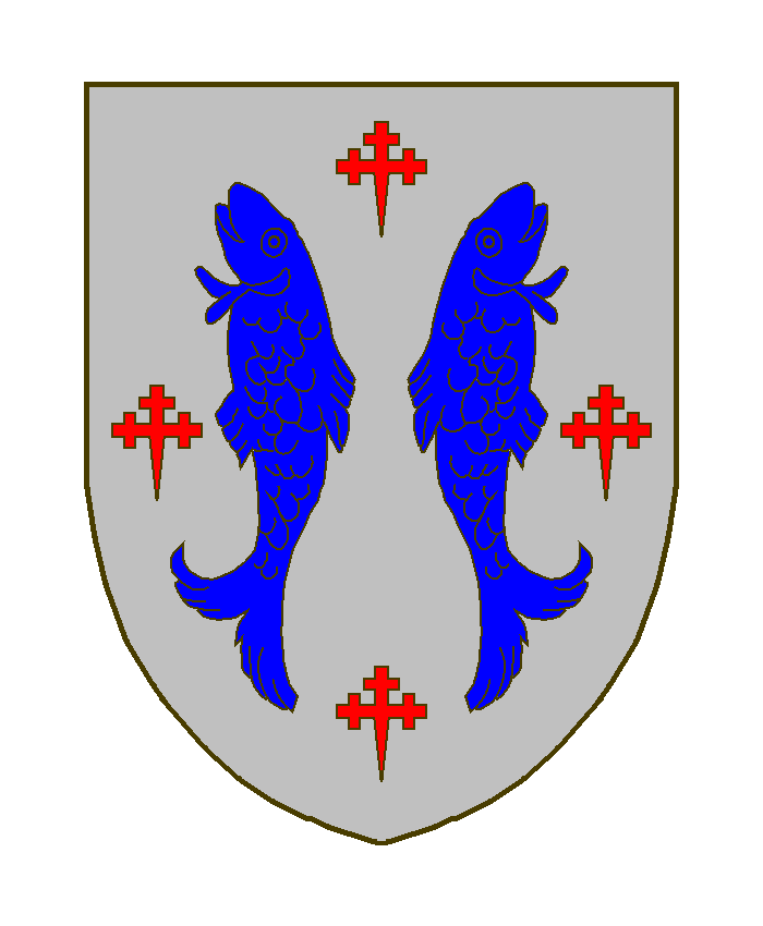 D’argent à deux barbeaux adossés d’azur cantonnés de quatre croisettes recroisettées au pied fiché de gueules