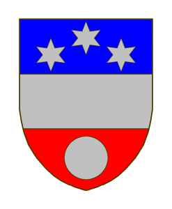 Coupé, d’azur à trois étoiles mal ordonnées d’argent, et de gueules à la boule d’argent, à la fasce d’argent brochant sur le coupé.