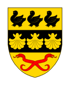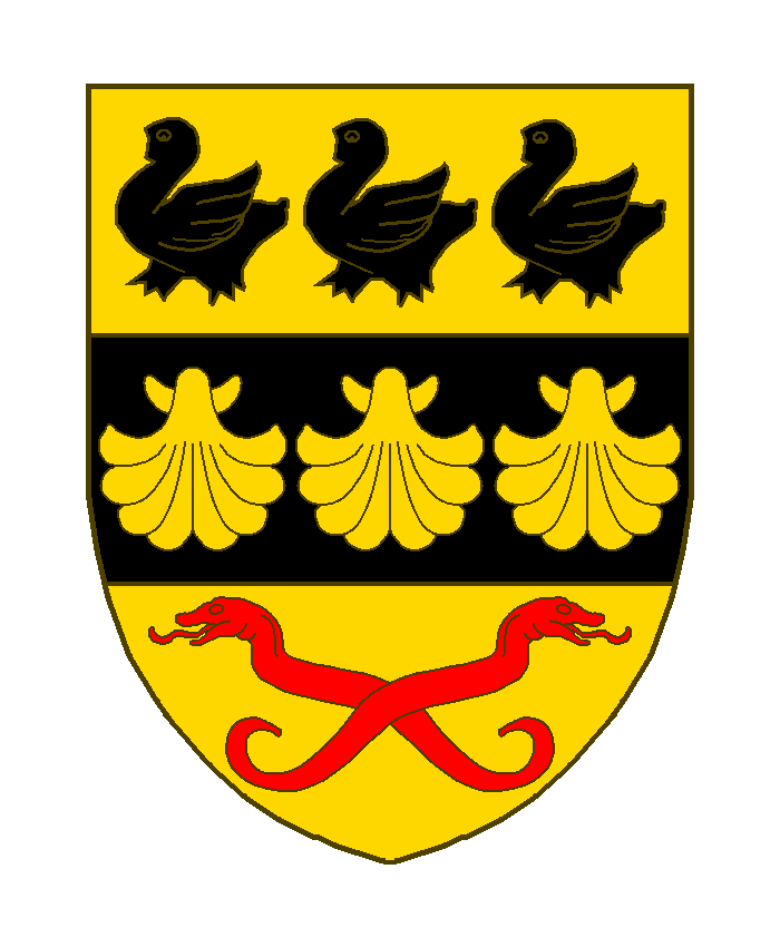 Cobreville – variante 3 Sizes: 150 × 150 / 247 × 300 / 700 × 850 de Cobreville - variante 3 Armes: D’or à la fasce de sable chargé de trois coquilles d’or, accompagnées en chef de trois merlettes de sable, en pointe de deux vivres de gueules passées en sautoir. Zitiert nach (Quelle): A.L. Seite 294