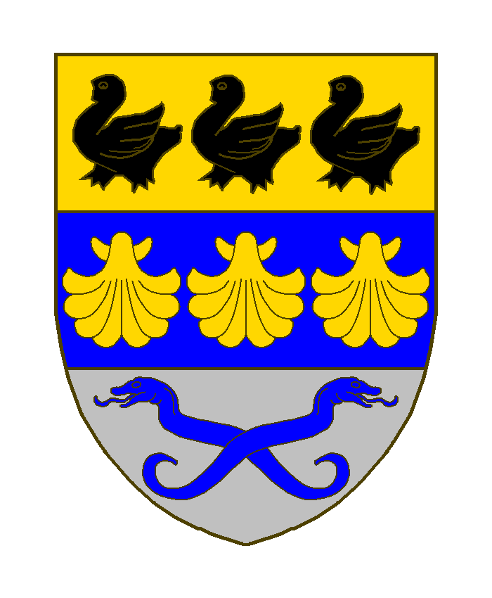 Coupé d’or et d’argent, à la fasce d’azur brochant, chargé de trois coquilles d’or, accompagnée en chef de trois merlettes de sable, et en pointe de deux guivres ou serpents d’azur mis en sautoir.