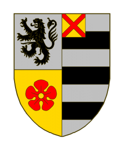Parti au I coupé d’argent au lion de sable et d’or à la quintefeuille de gueules, au II d’argent à trois fasces de sable, au franc-quartier d’or au sautoir de gueules.