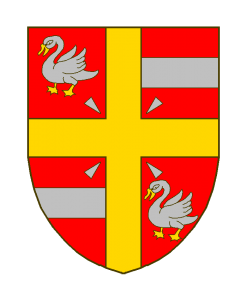 De gueules à la croix d’or, onglée de quatre clous de la passion d’argent, accompagnée aux I et IV d’un cygne d’argent, becqué et membré d’or, aux II et III d’une fasce d’argent.