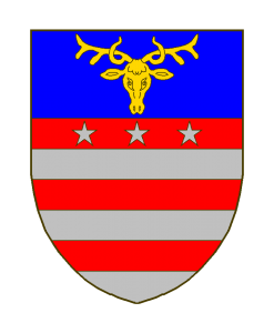 fascé de gueules et d’argent de six pièces, la première chargé de trois étoiles à six rais d’argent, au chef d’azur au rencontre de cerf d’or.