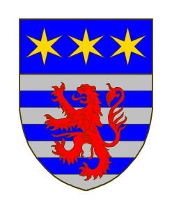 D’azur à deux fasces abaissées de gueules (sic!), surmontées d’un lion contourné issant d’argent, au chef d’azur, séparé par une fasce d’or chargé de trois étoiles d’argent (sic!) à 6 rais, brochant sur la partition.