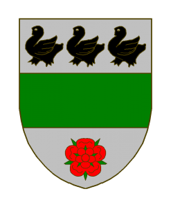 D’argent à la fasce de sinople, accompagnée en chef de trois merlettes de sable, en pointe d’une rose de gueules, feuillée de sinople.
