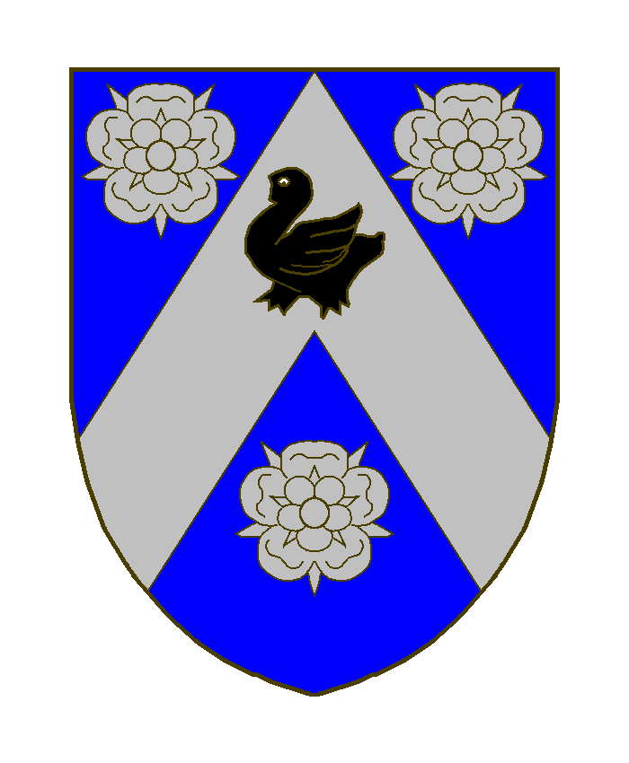 D’azur au chevron d’argent chargé d’une merlette de sable et accompagné de trois roses d’argent.
