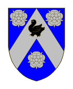 D’azur au chevron d’argent chargé d’une merlette de sable et accompagné de trois roses d’argent.