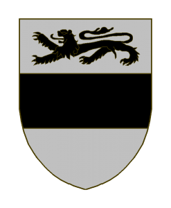 D’argent à la fasce de sable, accompagnée en chef d’un lion léopardé du même.