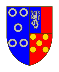 Parti au I d’azur à cinq annelets d’argent en sautoir, au Il Coupé, en chef parti d’azur au lion d’argent, et de gueules, en pointe de gueules à cinq besants d’or.
