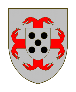 D’argent à la croix gringolée de gueules, à l’écusson d’argent à cinq tourteaux de sable, mis en sautoir, brochant.