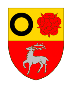 Coupé, en chef d’or à une rose de gueules adextrée d’un annelet de sable, en pointe de gueules à un cerf passant d’argent.