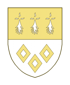 Coupé, en chef trois mouchetures d’hermine en fasce, en pointe trois macles, posées 2 – 1.