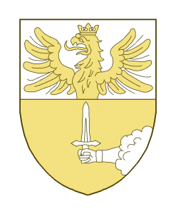 Coupé, en chef une aigle couronnée issante, en pointe un bras tenant une épée, sortant d’une nuée auflanc sénestre de l’écu.