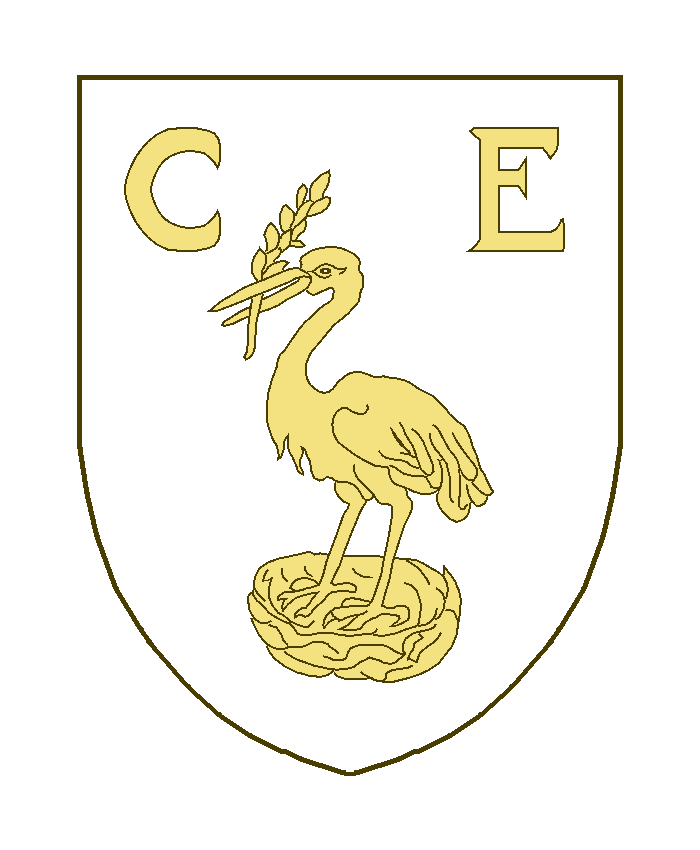 Une cigogne debout sur son nid, tenant en son bec un rameau de laurier, surmonté des lettres C.E.